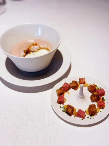台灣米芝蓮摘星之旅 :⭐️⭐️⭐️終於嘗試了提早一個月booking 米芝蓮三星的 #Taïrroir態芮 ,環境不大,只有七至八枱,主打台菜和法國菜的 fine dining, 所以餐廳會播放閩南話嘅歌曲,滿滿的台味!晚餐的菜單只有一款,菜式名稱特別優雅,味道其實有七成像法菜,三成像台菜,比較有印象是以下幾款🍽️ 大珠小珠落玉盤做法最簡單,但印象深刻的頭盤,其實就是用台灣新鮮的水果蓮霧,再配上魚子醬,清新的水果,再配上鹹香的魚子醬,味道出奇搭配,而且用最簡單的食材,做法!再加上加入了台灣和法國的元素,做出與眾不同的味道,這個創意令我非常佩服!🍽️tairroir 餐包原來現在已經不是國寶級大師吳寶春師傅出品的麵包,改為moon baking studio 出品,微熱的麵包加上牛油很香口,而且有淡淡的麥香,我個人喜歡有煙靭口感的麵包,這一點我覺得做得很出色!🍽️肝之如怡鵝肝是很常見的法國菜,中間再加上煙燻過的虱目魚,鵝肝淡淡的腥羶味配上鮮咸的煙燻虱目魚,沾上鬆軟的麵包簡直一流!👍🏻🍽️休息站的回憶構思原來來自來Taïrroir態芮主廚何順凱,因為小時候常和家人一起去休息站買茶葉蛋吃~最上層的餅乾撒滿五顏六色的繽紛花草,下層是茶葉半熟糖心蛋及番薯,上桌後服務人員會幫忙倒入帶有鹹蘿蔔的粥,這道菜印象很深刻,不單止外表精美,而且還充滿故事感,吃起來更特別!🍽️ 得牛汝願主菜用上了澳洲M9和牛,伴汁則用上了 黑蒜和梅子, 五成熟的M9 和牛肉質口感嫩滑,入口即融,香氣迫人,而香濃的牛肉汁配上酸甜的伴汁,中和了油膩的感覺,而且份量控制剛好,個人感覺覺得是我吃過最好的牛扒🥰🍽️ 甜品車食法國fine dining, 總會出現不少甜品菜式,這個佈滿了花的甜品車,一推出來驚喜連連,每人可以選擇三款甜品,有部份甜品更是用台灣的茶葉和水果去製造,味道和一般法式甜品很不同,而且細小精美,可以嘗試不同口味,也會不太漏 😋 伴茶或咖啡剛好!嘗試過二星餐廳,再嘗試了三星餐廳,終於了解到分別,三星餐廳除了菜式有創意之外,服務上也會較為細心,例如顧客去洗手間時, 侍應會幫你摺好餐巾,回來後再幫你細心鋪上, 倒酒的方向和站立的位置🧭 也非常正式!所以米芝蓮三星餐廳,的確名副其實,去之前也有做過研究,有些人評論覺得不好吃,可能未必有那麼多人接受到創新的菜式,但整體上來說我覺得還是很好的,想感受台法風味的西餐,也可以去試試看!😋查看更多