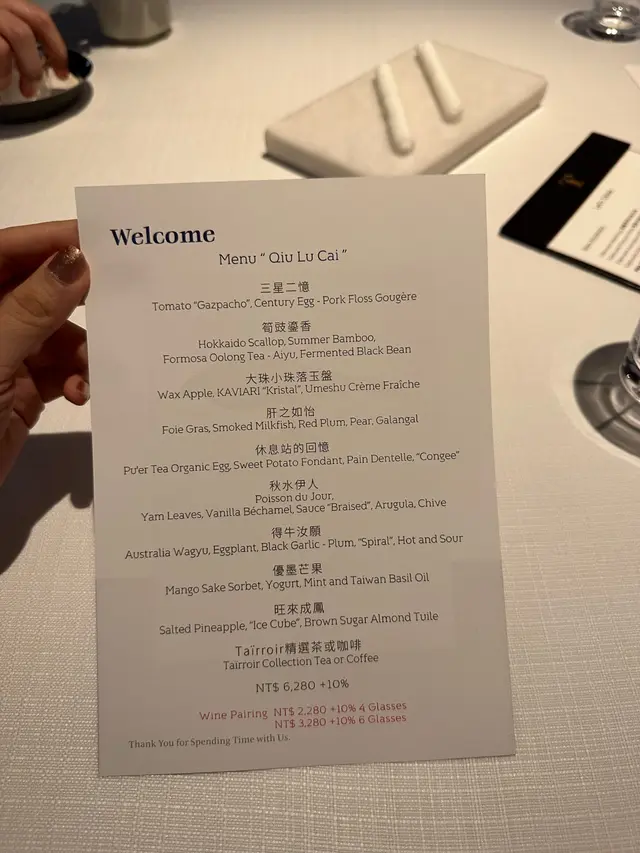 Tairroir為台北米芝蓮三星餐廳🌟🌟🌟,以台灣本土特色食材為主,研發出一系列精緻料理盛宴。.🍴Lunch menu “Pong Pai” NT$3,880.▫️餐前小食 - 紫菜鮮蠔脆卷 🦪蠔肉大而鮮美多汁,卻不會令外層變軟,新鮮一出爐便立即送上餐桌,保持最鬆脆口感!.▫️餐前小食 - 青瓜青萍果脆批 🥒酸甜口感一解脆卷油膩,不過不失。.▫️三十而栗 🌰第一道菜已經被驚艷!幼滑濃湯以茶杯形式呈現,表層泡沫以淡淡油脂配襯出多層次濃湯,旁邊的小批亦穌脆無比,一查才得知主廚於2021年曾獲得Asia Best Pastry chef🧑🍳 .▫️蟹逅 🦀以大量北海道毛蟹肉製成,配以牛油果醬配搭出清新又creamy口感。.▫️迷魂香芋泥鴨 🦆以半熟蛋及芋泥為基底,加入香口材料如鴨肉乾、櫻花蝦等增強口感層次,特別又創新!.▫️秋水伊人 🐠以西式手法烹調魚肉,魚肉細膩,另有中式醬汁增強鹹香味道。.▫️彘手可熱 🐖台灣山豬肉以半熟形式烹調,厚實有咬口,另配一口份量山豬肉丸糯米飯呈現兩種食法。.▫️龍蝦炒飯 🦞 (+NT$1600)以原隻龍蝦肉十分足料,炒飯味道與鐵板燒炒飯相近,不算有太大驚喜。.▫️優墨芒果 🥭芒果雪葩中加入清酒中和甜味,再配以乳酪微酸味解膩。.▫️桔光苒苒 🍊另一驚艷之作❣️以豆乳製作panna cotta ,豆味超級濃郁!再加以脆脆及雪糕多重口感又有特色👍🏻.💬 整個午餐體驗將近2.5小時,以價錢來講絕對值回票價,菜品種類豐富之餘又有特色,服務亦滿分💯.Tairroir is a three-star Michelin restaurant in Taipei, renowned for its use of Taiwan's local ingredients to craft an array of exquisite culinary feasts..🍴 Lunch menu “Pong Pai” priced at NT$3,880.▫️ 𝐀𝐦𝐮𝐬𝐞 𝐁𝐨𝐮𝐜𝐡𝐞 - 𝐂𝐫𝐢𝐬𝐩𝐲 𝐒𝐞𝐚𝐰𝐞𝐞𝐝 𝐎𝐲𝐬𝐭𝐞𝐫 𝐑𝐨𝐥𝐥 🦪Generously sized, juicy oysters encased in a crispy layer that remains firm, served fresh for a delightful crunch!.▫️ 𝐀𝐦𝐮𝐬𝐞 𝐁𝐨𝐮𝐜𝐡𝐞 - 𝐂𝐮𝐜𝐮𝐦𝐛𝐞𝐫 𝐚𝐧𝐝 𝐆𝐫𝐞𝐞𝐧 𝐀𝐩𝐩𝐥𝐞 𝐂𝐫𝐢𝐬𝐩𝐲 𝐓𝐚𝐫𝐭 🥒Balances the previous dish's richness with a refreshing, tangy taste..▫️ 𝐂𝐡𝐞𝐬𝐭𝐧𝐮𝐭 𝐒𝐨𝐮𝐩 🌰The first dish is astonishing! A silky, tea-cup-shaped soup with a foam top delicately layered, accompanied by wonderfully crispy bread. The revelation that the head chef was awarded Asia's Best Pastry Chef in 2021 adds another level of appreciation.🧑🍳.▫️ 𝐂𝐫𝐚𝐛 𝐀𝐝𝐯𝐞𝐧𝐭𝐮𝐫𝐞 🦀Crafted with abundant Hokkaido crab meat and paired with avocado sauce, creating a fresh and creamy texture..▫️ 𝐄𝐧𝐜𝐡𝐚𝐧𝐭𝐢𝐧𝐠 𝐓𝐚𝐫𝐨 𝐃𝐮𝐜𝐤 🦆Combining semi-cooked egg and taro paste with textured elements like dried duck and sakura shrimp for a distinct and innovative dish!.▫️ 𝐀𝐮𝐭𝐮𝐦𝐧 𝐖𝐚𝐭𝐞𝐫'𝐬 𝐋𝐨𝐯𝐞𝐫 🐠A Western-style preparation of fish, rendering a delicate fish texture with added depth from the Chinese-style sauce..▫️ 𝐒𝐢𝐳𝐳𝐥𝐢𝐧𝐠 𝐏𝐢𝐠'𝐬 𝐇𝐚𝐧𝐝 🐖Taiwanese wild boar cooked in a semi-cooked form, presenting a robust texture, complemented by a side of glutinous rice with wild boar meatballs offering two different culinary experiences..▫️ 𝐋𝐨𝐛𝐬𝐭𝐞𝐫 𝐅𝐫𝐢𝐞𝐝 𝐑𝐢𝐜𝐞 🦞 (+NT$1600)A generous amount of whole lobster meat in the fried rice, resembling teppanyaki-style fried rice but lacking a surprising element..▫️ 𝐌𝐚𝐧𝐠𝐨 𝐒𝐨𝐫𝐛𝐞𝐭 🥭Mango sorbet infused with sake to balance sweetness, paired with a slightly tangy cheese for a refreshing finish..▫️ 𝐒𝐨𝐲 𝐌𝐢𝐥𝐤 𝐏𝐚𝐧𝐧𝐚 𝐂𝐨𝐭𝐭𝐚 🍊Another stunning creation! A panna cotta made with soy milk, exuding a rich soy flavor, complemented by various textures and a unique touch.👍🏻.💬 The entire lunch experience lasted nearly 2.5 hours and undoubtedly justified the price. The variety and uniqueness of the dishes, coupled with exceptional service, earned a perfect score!💯…查看更多