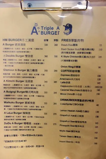 這半年以來不論來自各地的漢堡,都在東區這個漢堡大本營裡展開了激戰,Triple A 主打泡菜口味與燒肉片和豆腐等韓系食材入味的美式漢堡,且主廚也是來自韓國上過許多節目的名廚,來台後首間店便駐足於東區來勢洶洶將一較高下。位在敦南誠品側面的巷弄中,與最近火紅的Caliburger加利堡,藝人梁靜茹老公新開幕餐廳,號稱全台灣最好吃的漢堡,僅隔一條街相對,且都主打自助式與開放式空間,對於愛吃漢堡的人來說,真是有福了。門面走木色系簡潔路線,伴著少許戶外座,有別於以往的漢堡店走著粗獷路線,而Triple A則更像是個韓系咖啡廳,讓人在這可以放空一下午。入門後的點餐吧檯依舊保持咖啡廳風格,若不是特地前往真的很難發現是一間漢堡店!櫃台前擺放著店家主打的韓國氣泡飲料,小小一瓶十分繽紛可愛,再喝膩了美式汽水後,換換口味也不錯。用餐區約能容納20組客人,線條簡潔明亮,店內採自助式點餐且不收服務費。隨處掛著收集的小壁畫,非常年輕輕鬆的裝潢。韓式烤肉堡$355(附薯條、飲料)單點$295店家特選肉片與特調韓式醬料一起炙燒,搭配生菜,底層抹上蒜味美乃滋,味道搭配得還算滿強得宜,肉不至乾柴但卻很膩口,整體沒有記憶點。則是麵包實在太不用心,接近於早餐店的麵包口感,過度鬆軟不扎實,吃完非常空虛。這樣的價位與品質差距很大,不推薦。薯條相對討喜許多,粗度與脆度都有水準之上,若油能在瀝乾點會更好。韓式雞肉$185另外這也是店家主打的招牌,漢堡搭配韓式炸雞,挺有創意的搭配裹上輕薄麵衣後下鍋油炸,起鍋後與韓式甜醬均勻攪拌。但Triple A的炸雞吃起來,則少了那層麵衣的酥脆。比較像是微微爆香後直接與甜醬攪拌,瞬間有種再吃三杯雞的錯覺,還有點過油,也不太討喜。推薦順序:韓式雞肉>韓式烤肉堡最喜歡採新店的我,這次居然不小心誤入了雷區。Triple A的漢堡與炸雞吃起來都差強人意。定價也有點偏高跟品質出入甚遠,或許是店家還在試營運階段,進步空間還非常大。…查看更多