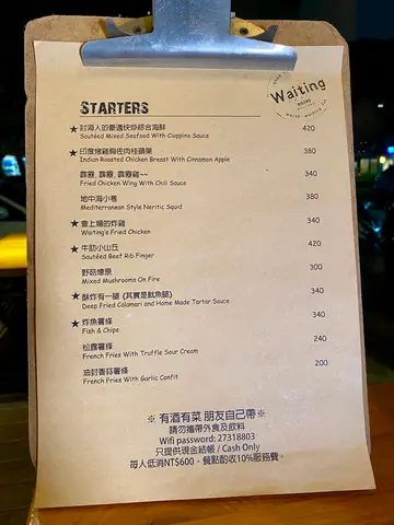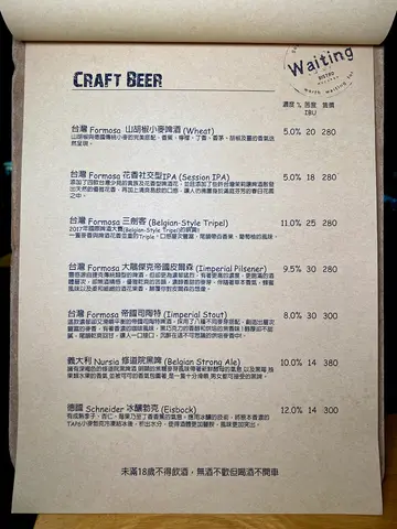 講到經典精釀啤酒餐廳Waiting Bistro 相信喜愛精釀的台北人都會有聽過 在忠孝復興捷運附近也營業滿長一段時間小酒館的用餐方式很有魅力 不會太吵雜, 有點私廚感~ 大約30席右座位, 木質裝潢就像在歐洲酒吧用餐般的感覺, 讓人感到舒適放鬆, 也不會太過於制式化~ 精釀啤酒是是Waiting Bistro 最推薦用來搭配下酒菜的選擇, 有固定品項會在菜單上面簡單介紹 也可按照自己喜歡的口味請服務人員幫你挑選 完全按照客人的喜好來安排, 覺得蠻貼心的每天球賽精華回顧增加了運動酒吧感當天播放大聯盟棒球賽, 下班喝個酒看看回顧完全就是國外生活感覺啊哈哈~開放式廚房的設定有私廚跟廚師互動的感覺完全看到烹調過程, 也不會有很重的油煙味 一個人來還可以坐在吧台旁, 感受一下寧靜又有氛圍的用餐 簡單餐具設定並不是一個很拘束西餐路線很適合下班約會 或者是跟新朋友第一次認識來用餐採用分享主餐方式, 吃得到更多不同的餐點 日本埼玉県小江戶 Coedo.在台灣提到精釀啤酒, 通常都會想起歐洲或者是紐西蘭來自日本埼玉縣, Shiro 代表白色 純淨未過濾的小麥 , 加上麥芽和特殊酵母是款非常清新的啤酒, 酒味並不會太重, 帶著天然香甜感加上日本一向對釀酒水質的重視, 很適合用來佐餐 今天跟朋友點了四份餐點來做分享, 兩個人吃蠻剛好的也可以吃到很多元的餐點喜歡這種分享式的餐酒並不是固定是每個人一份一份的上適合配酒聊天 餐點份量還蠻多的 趕快帶大家看看我們今天吃了什麼好料吧 牛肋條小山丘 $420牛肋條大概是我在家自己烹調過最多的牛肉部位平時就很喜歡買回家乾煎, 這邊廚師選用巴薩米克紅酒醋, 整個香氣就讓人垂延三尺上桌時有大片蒜香奶油就像傳統牛排用到牛排上方一樣紅酒醬完整融入牛肉口感當中肉質本身非常不錯, 都有做基本斷筋處理吃起來軟嫩多汁 , 直接搭配紅酒醬不用額外調味就很夠味, 如果喜歡紅酒醬, 還可以利用下方兩片麵包包著吃個人覺得蠻讚的 快炒綜合海鮮 $420蛤蠣 | 淡菜 | 多利魚 | 白蝦走一個義式風格, 使用海鮮濃湯湯汁濃縮入味, 番茄汁口感比較偏甜, 可以利用檸檬去混搭出酸香的口感附上兩片蒜蓉麵包沾醬一同享用 軟嫩有Q度的口感很有滋味蝦子新鮮 , 淡菜蛤蠣吃起來也多汁飽滿 多利魚口感細緻 喜歡配這醬料的感覺, 和平時火鍋吃到的呈現很不一樣松阪豬松露燉飯 $480松露下非常誇張搭配上蕈菇和帕瑪森起司香氣濃郁滿點使用義大利米料理 , 米心會比較硬我個人喜歡松露香氣完美融入每一粒米中 松阪豬倒是比較偏向台式炒香香氣還蠻足夠的, 松阪豬Q彈不油膩 和義大利米特性是個非常不錯的結合, 也是我今天最喜歡的一道菜普羅旺斯雞腿青醬奶油筆管麵 $420自製醬奶香味較濃厚,青醬整個香氣非常突出 整隻大雞腿的份量也蠻霸氣整體口味上是很偏向歐式風格 也就是青醬味道是蠻重的,搭配均衡美味的筆管麵會保有一點麵芯感每口就可以吃到醬汁濃醇香最後忍不住拿湯匙把青醬全部吃光光 , 整體燉飯跟義大利麵的價位絕對很值得,不輸頂級高價義式餐廳~ 有些餐酒館喜歡搞得很華麗複雜, 有些喜歡專注在酒類跟食物的簡單搭配Waiting bistro 就是屬於後者酒類選擇多, 簡單舒適的環境搭配上親切友善服務, 重點是下酒菜真的好吃整個氣氛很適合歡樂微醺, 喜歡簡單喝酒配餐絕對大推薦 …查看更多