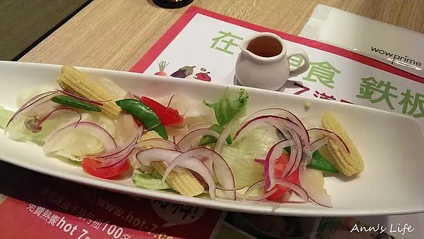 和夏慕尼以及王品集團旗下的大多數餐廳一樣,hot7按慣例提供固定價位的套餐,一人$290加一成的價位很漂亮,從飲料到沙拉、湯品、主餐、副食、時蔬及甜點,一式七道是個相當完整的set,這也是號稱新鐵板料理的原因之一,有精緻鐵板燒的企圖,卻有著平價鐵板燒的價格,除非料理功力太差,不然要不受歡迎也難。