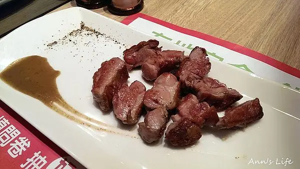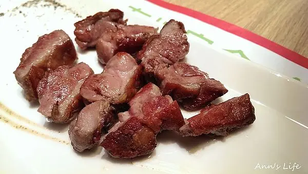 兩個都愛牛肉的人一起外出吃飯常常會打架的,因為經常想點一樣的餐,但又想試試不同口味,總得有人妥協,櫻桃鴨也是我們的共同喜好,難得用餐初訪,便決定主餐一鴨一牛來pk一下哪個較好吃,點餐的時候店員有事先提醒我們鴨腿的部分會比較有咬勁,沒想到還真的是很費牙口功夫,皮厚肉結實,需要花好多時間去咀嚼,但乾煎的香氣吃的到,如果鴨腿不是像練過身體那麼樣的緊實難嚼,在口中蔓延開來的鴨肉香還是很吸引人的。