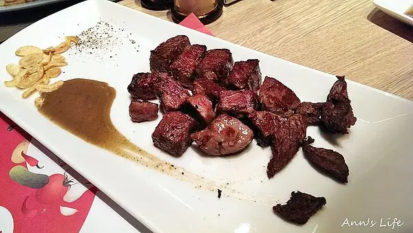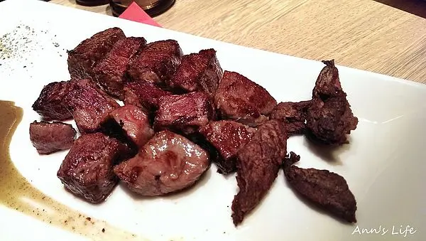 理應是受到高度期待的炙燒牛排,在hot7堅持一貫的硬肉質之下怎麼也咬不斷,如果不是因為明顯的牛肉味讓我們確認自己吃的是牛排,還真像在咬橡皮筋,特別是最右邊幾塊乾黑完全無肉汁的部位,送上桌時店員有說明是板腱部位較有嚼勁,但實際上就是乾到難以入口,店員前來關切餐點狀況的時候,J也馬上提出反映,對方回應可能因為部位不同的原因所導致,詢問需不需要幫我們重做一份,其實我們已經很飽了,也不想浪費眼前的食物,便婉拒了店員的好意,但老實說,雖然我自認很好養吃東西不太挑嘴,但對牛排的熱愛只能讓我們給hot7的牛排打不及格分數,就連以前住家附近的平價鐵板燒牛排都贏過這裡。