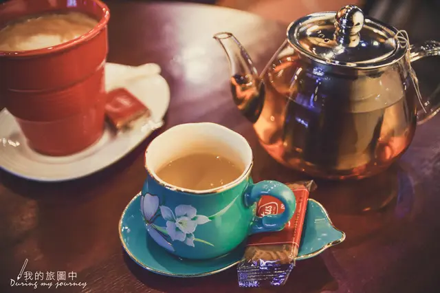 店家送上晶瑩剔透的茶壺,湖水綠的茶杯上彩繪著精緻的花朵,