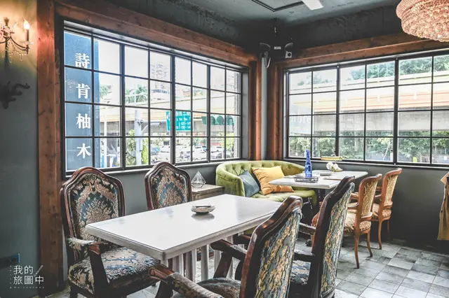 才剛進餐廳沒多久的我,立即拿起相機拍個不停,不論是哪個角落都藏著獨特的古典美,刻著華麗花紋的椅子像是歐洲王公貴族平時用餐的座椅,隔壁桌卻放置了現代風的青綠色沙發,窗外則是台北的日常街景,頓時讓人感到時空交錯,完全是個有趣的景色(笑)。