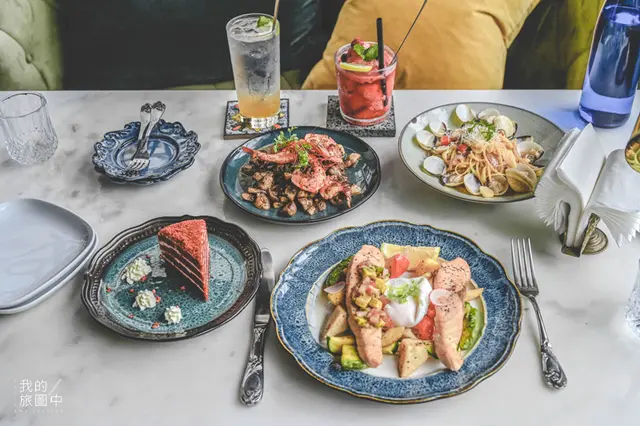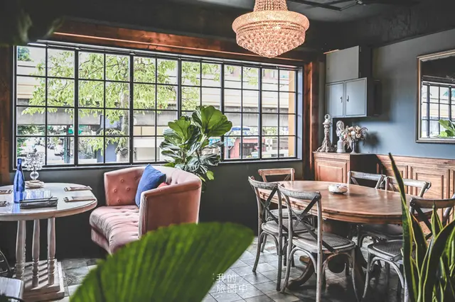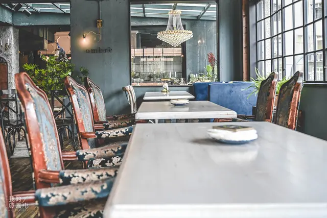 才剛進餐廳沒多久的我,立即拿起相機拍個不停,不論是哪個角落都藏著獨特的古典美,刻著華麗花紋的椅子像是歐洲王公貴族平時用餐的座椅,隔壁桌卻放置了現代風的青綠色沙發,窗外則是台北的日常街景,頓時讓人感到時空交錯,完全是個有趣的景色(笑)。