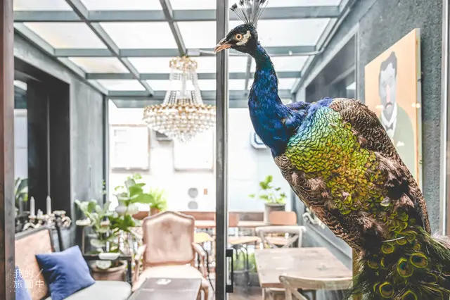 餐廳裡有個半戶外座位區,宛如一個小包廂可以不受外頭的干擾,門口放了一隻吸睛的孔雀站崗,很難讓人忽視它的存在(笑),因為相當逼真,我還觀察它到底是不是標本?