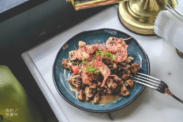這道前菜很對朋友的胃口,蝦子吸收了飽滿的黑松露醬汁、以及蘑菇的香氣,變得十分鮮美且Q彈多汁,像是把將精華都濃縮在肉質裡,口感非常多層次,蘑菇經過翻炒之後,散發出淡淡的黑松露香氣,整體來說是很完美的結合,但私心覺得蘑菇炒得再乾一點會更好。