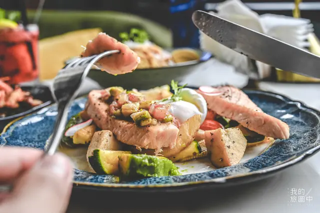 我很喜歡吃鮭魚,再加上看到水波蛋這三個字更是難以抗拒,一端上來就被陣陣香氣給迷昏了(笑),兩條鮭魚排底下則藏著杏包菇、酪梨、番茄、小黃瓜、玉蜀黍等等,非常的健康,而鮭魚的肉質很豐厚又扎實,塗上莎莎醬則多了一層酸甜的口感,擠了檸檬汁後又更上一層樓,喜歡半熟蛋的人一定不會想錯過水波蛋,一切開新鮮的蛋黃有如瀑布立即順勢流下,讓人忍不住大快朵頤了。