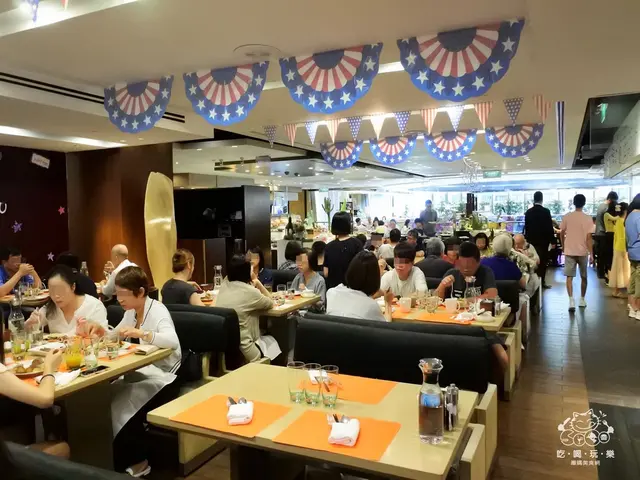 ▲『香格里拉台北遠東國際大飯店 遠東Café 自助餐廳』餐廳從11:45開始入場用餐,不過時間還沒到就可以看到好多客人已經在門口大排長龍準備進去享用美味的餐點,沒多久人潮就把餐廳擠得滿滿的,簡約樸實現代風格的裝潢設計,讓顧客可以在這邊輕鬆的用餐。