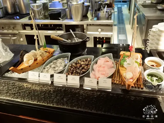 日本料理區有握壽司、生魚片、蝦子、現在還有季節性的螃蟹,各式生魚片都擺放在檯面上展示,用那漂亮的紋理、細密的油花吸引著愛吃生魚片的小編!!有烤魚下巴、烤牡蠣、海螺,新鮮的蝦子及清蒸螃蟹,新鮮的海鮮只需要用最~簡單的蒸或烤方式,最能吃出食材本身的鮮甜口感和新鮮度!!喜歡吃海鮮的朋友肯定這區能盡情的大啖~