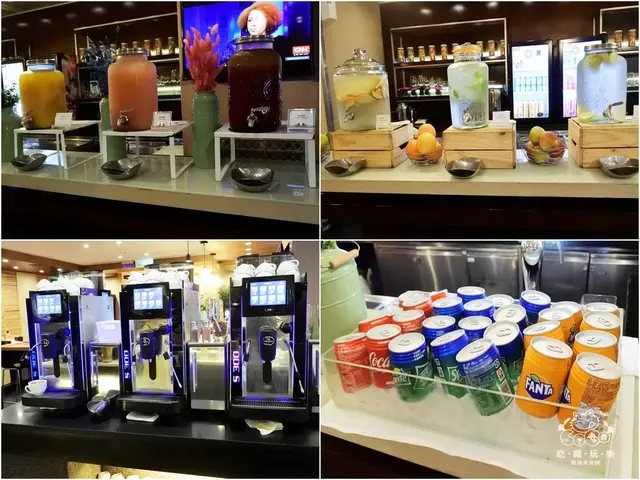 自助飲料區提供咖啡、可樂、雪碧、芬達、柳橙汁、粉紅檸檬水、南方甜茶、水果風味水、薄荷風味水、檸檬風味水、薰衣草奶茶、厚奶茶、蜂蜜洋甘菊茶。玻璃罐裝的飲品,透著精緻的燈光,讓人每一種都想品嘗一口!水果水喝得到青蘋果樂園的香甜;薄荷風味水最適合夏天,彷彿看到窗邊風鈴靜靜地低喃;檸檬風味水是暑假的青春;粉紅檸檬水裡,葡萄柚與檸檬恰到好處的比例,像輕熟女般在青澀與沉穩中搖擺前進;蜂蜜洋甘菊茶彷彿溫暖的姊姊一樣給甜而不膩的保養;厚奶茶中濃濃的奶香與茶葉,不禁讓人感覺青春就該瘋狂!眾多飲料滿足你挑剔的味蕾~