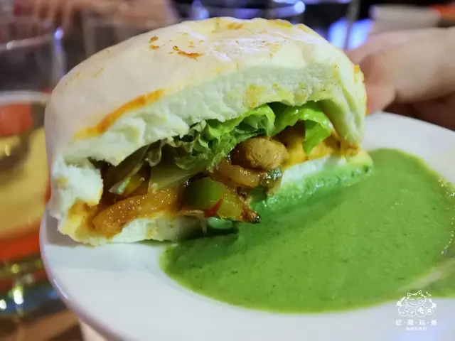▲『香格里拉台北遠東國際大飯店 遠東Café 自助餐廳』咚咚咚~~超special 的隱藏版餐點來了~當然香格里拉不會只有這麼安靜得滿足各位老饕,活動期間還有敲鑼打鼓,有服務人員突然打起鑼來吸引大家注意!!接著呢~~每個人都有一個特別的漢堡,這長相…是刈包嗎?你以為只是單純的台式刈包嗎?!這你就小看了!!一口咬下內餡竟然是以中東風味的香料及肉和配菜佐出特色風味~所有香料漸漸在嘴巴裡化開,繚繞上騰,搭配特製青醬~非常有特色!!彷彿聽見遠方駱駝的鈴聲! 想要問問主廚大人,揭開這味道的神秘面紗啊~~應該是只有這邊獨有~~只能說非常幸運因為發放完之後好像就沒有再出來了~~