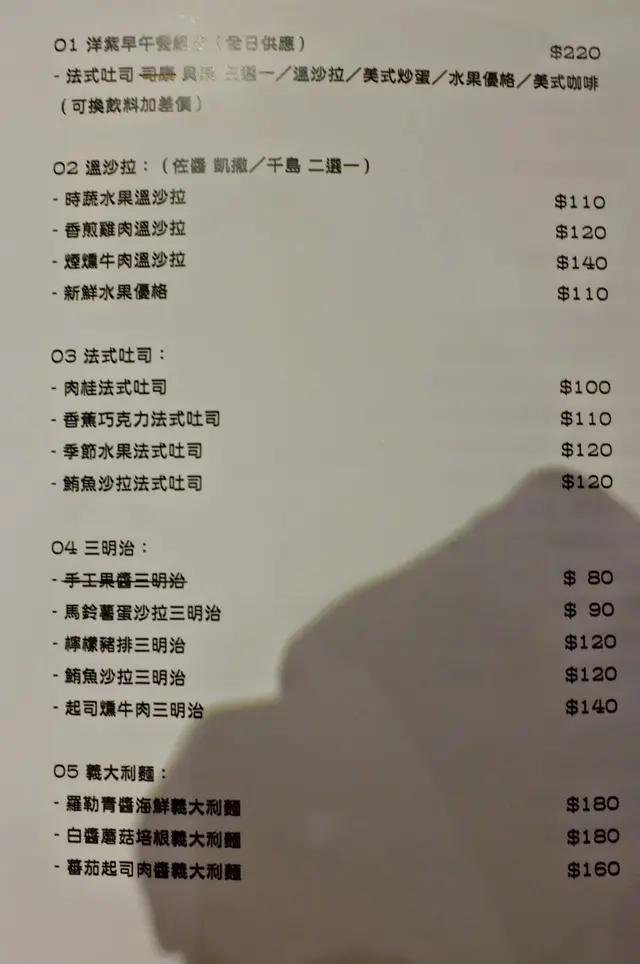 雖說如此,Menu卻很豐富,除了正餐、下午茶外也有咖啡和甜點,重點是價位平實,加上整片的落地窗遠離都市的喧囂是金錢難以衡量的。