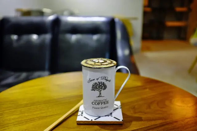 照例點了一杯熱摩卡,杯子是店內販售的琺瑯杯,配上幾何圖形的拉花,還沒入口就先有了視覺上的享受,可以感受到老闆對於器具上的用心。