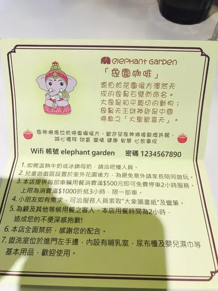 小朋友如有需求,可跟服務員索取大象圖畫紙及蠟筆。