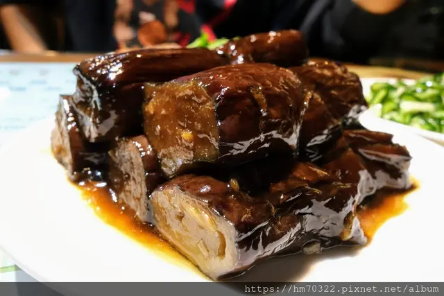 茄子size似乎也是挑選過寬度差不多,切成剛好一口大小再疊起來,猜測茄子是水煮後再與醬料拌炒(煮)?