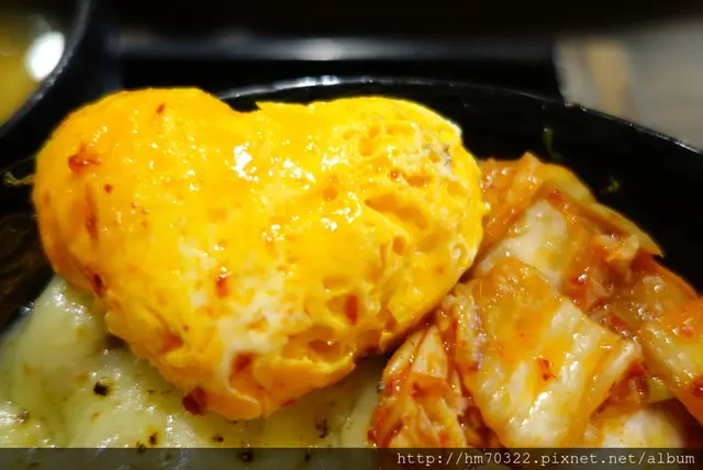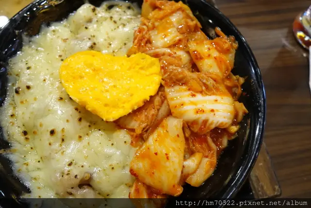 丼飯的左邊舖滿焗烤過的起司,右邊舖滿韓式泡菜,而中間…中間…中間這個是什麼東東?把鏡頭拉近瞧瞧!