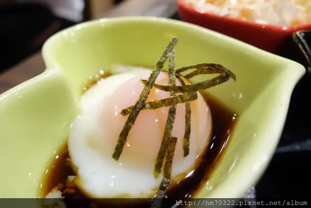 月見溫泉蛋下面是搭配甜甜的醬汁上面撒上海苔絲配色,從外表看會以為中間的蛋黃會爆開流出…