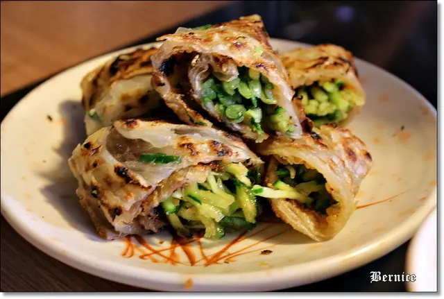 烤得酥脆的蔥油餅配上小黃瓜吃來格外清爽
