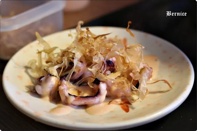 烤熟的章魚塊淋上千島沙拉醬最後放上柴魚