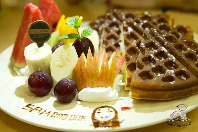 店內的招牌水果鬆餅,特色在於可以選擇黑糖麻糬或是白麻糬作為內陷。