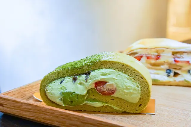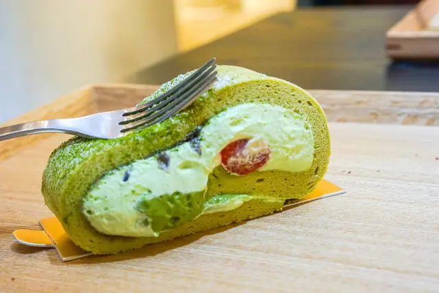 我也不知道我拿叉子壓著這塊蛋糕是在幹嘛?測彈性吧。彈性很不錯,海綿蛋糕比較紮實水分比較多,所以吃起來口感不是那一種蓬鬆感,內餡是抹茶奶油還有蜜紅豆跟草莓,奶油確實接近日式作法,因為甜點師就是日本人阿,哈哈哈,但我老覺得少了一味且跟我在日本吃的奶油也不同,我認真的覺得 雞蛋 奶 水 真的會因產地國家不同而有所差異。