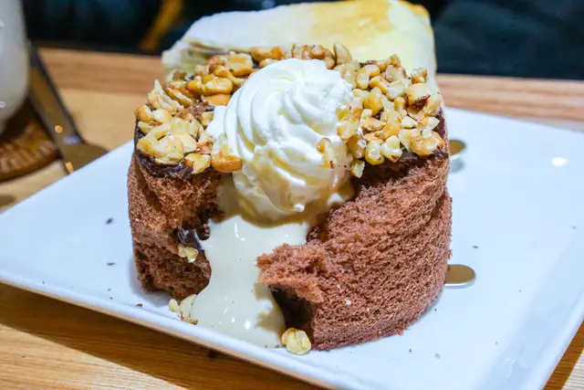 WOW 要在軟綿綿的戚風蛋糕裡面夾心不是件簡單事,我一開始不知道裡面有內餡,光從表面看會覺的似乎太過簡單,不過戚風蛋糕簡單吃原味其實就很棒,主廚大膽的加入了液狀夾心,是確實需要做好蛋糕比例的,巧克力戚風蛋糕做得不錯,蓬鬆度可以,口感綿密甜度則是適中,因為內餡是伯爵茶醬,味道組合是我當天吃到的甜點裡算不錯的。