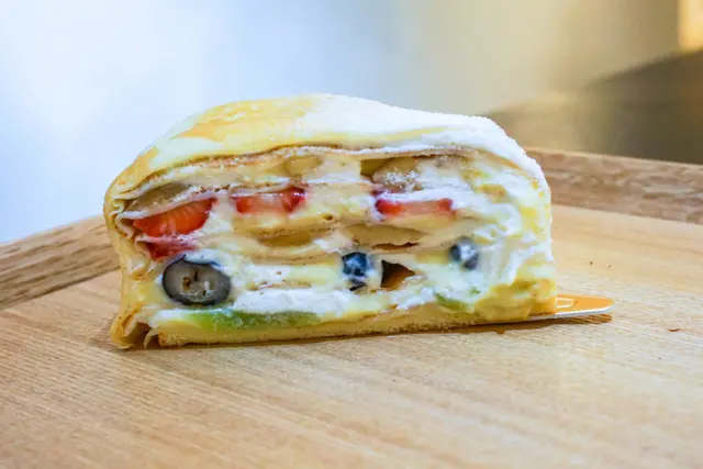 說真的,好貴且我很失望,號稱口感接近日本Harbs蛋糕店的水果千層,因為我個人不是很喜歡千層蛋糕,所去日本我都不點大家最愛的水果千層,這一款蛋糕外觀的確吸睛,層層水果加上濃郁卡士達醬,口感很軟,我就先不愛了,吃一口,我整個起雞皮疙瘩,因為裡頭是很濃的香蕉味道,我懼怕香蕉製品,向來敬謝不敏,所以我擔心我是否因為不愛香蕉而失去評斷,於是影樂哥吃,他吃了之後也覺得不是喜歡,他只用一句話結尾:香蕉味道已經完全壓過整份蛋糕,吃不出任何其他味道了。