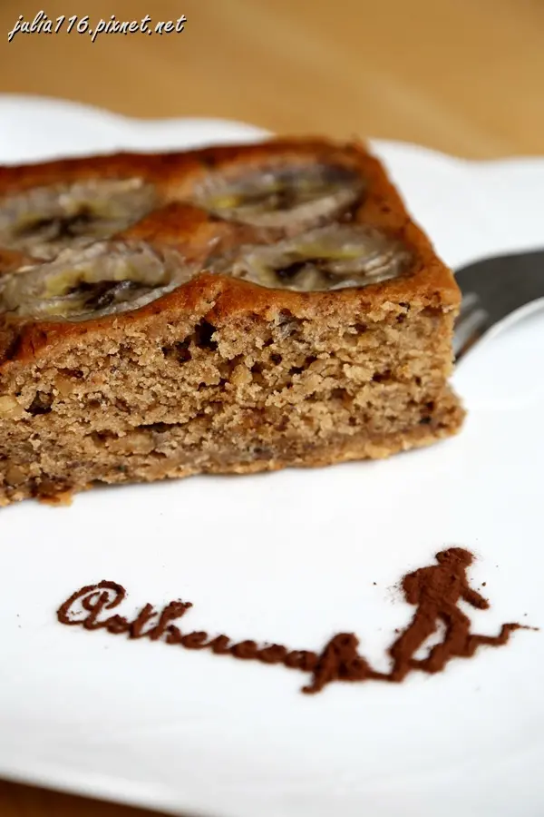 溫熱的香蕉蛋糕散發陣陣香味,邊邊還以巧克力粉畫出artherecafe及一個人上階梯的圖案,超Cute!