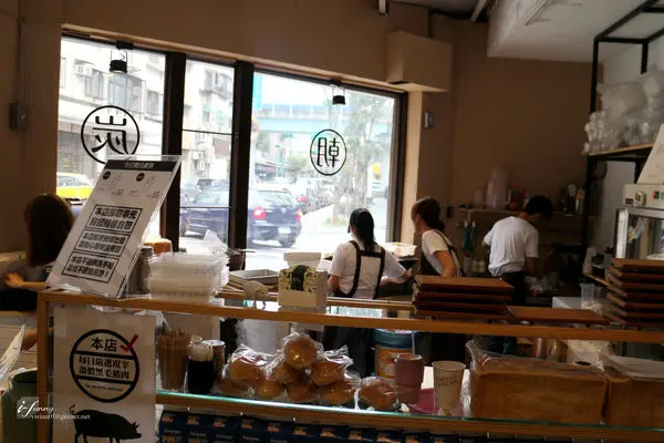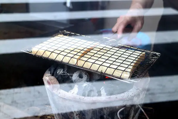 製作區以透明落地窗展示餐點製作過程,燒紅的碳,正在烤著吐司。