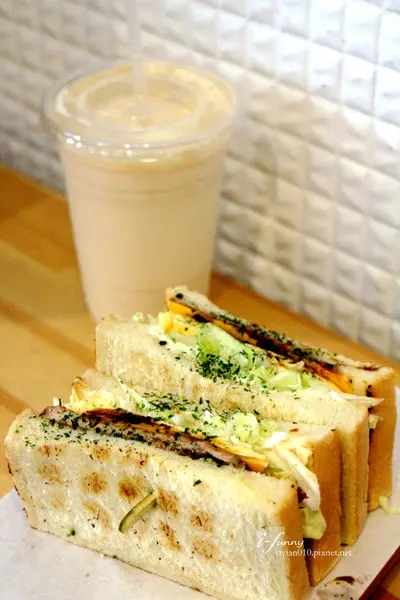 台北五常國中對面的<上山採覓>,提供現場碳烤吐司三明治,現打的香濃花生牛奶。