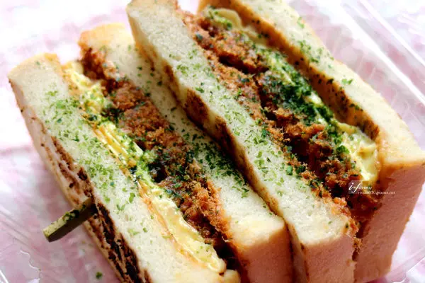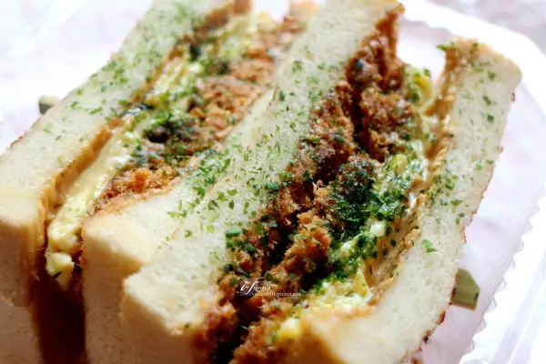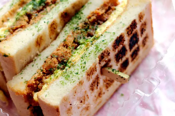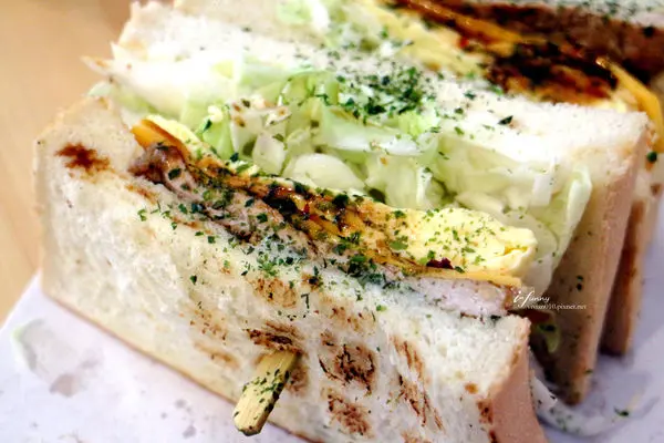 辣醬是抹在吐司上,疉上肉片、起司、煎蛋、高麗菜後對切,最後再灑上海苔粉。