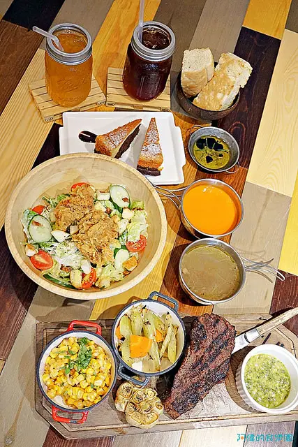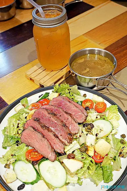 不得不說,這麼大一盤生菜沙拉,還有好多片碳烤五分熟的美國牛排,而且是選用美國安格斯牛肩胛部位切出的 Flat Iron Steak 平熨牛排,再加一杯飲料或一碗湯,卻只要200加一成,這在台北市簡直不可思議的平價啊!