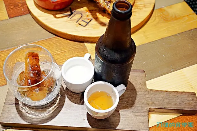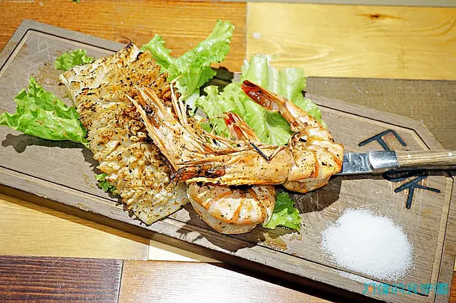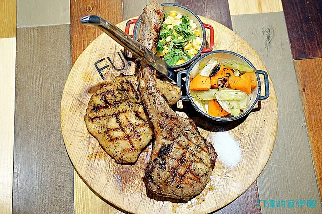 美國盤克夏黑豬帶骨里肌(12~15oz),直火碳烤約 20 分鐘後豪邁上桌,無需沾醬,即可品嚐香 Q 口感,以及飄散煙燻香氣的細緻甘美肉質,骨邊肉帶筋膜愈嚼愈香。