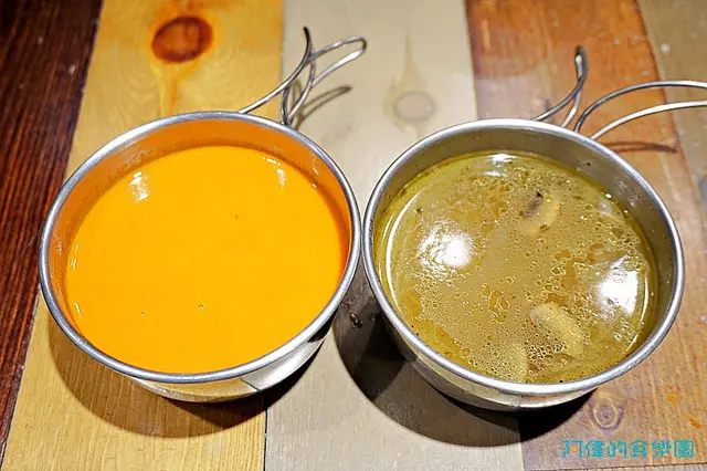 兩碗不同的湯,阿偉喝的是左邊的番茄湯,右邊是蘑菇湯。