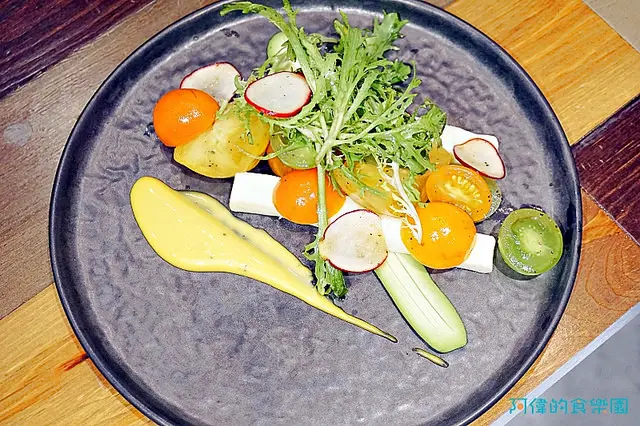 所謂的水牛起司就是馬札瑞拉起司,切成白色長條狀,軟軟嫩嫩的。與兩種小番茄及一些蔬菜組成漂亮的顏色。盤上一抹黃色甜甜的醬汁,讓味覺更豐富。