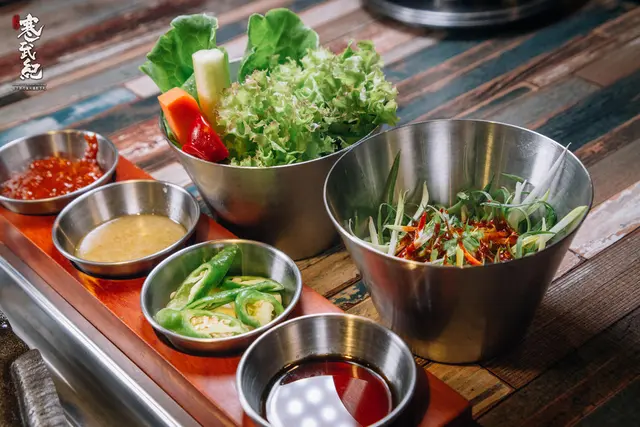 韓國廚師親自傳授獨特韓式醬料,口味獨到!有點韓式辣醬濃稠的口感,辣中帶些許甜味,很特殊的沾醬,放在烤盤上熱著吃,即使在韓國也很少見~~這一點很特別!