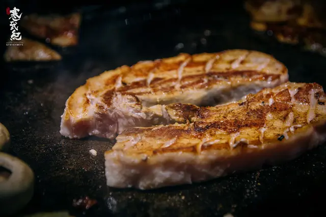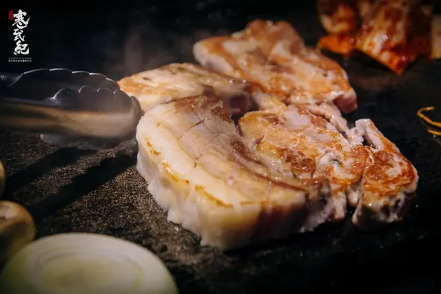 在烤盤上烤的滋滋作響的伊比利五花肉真是有夠迷人,厚切!加上濃郁的油脂香氣,是韓式烤肉的精華!