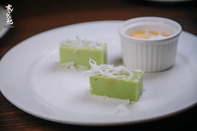 香蘭米糕,很特別的南洋甜點,吃起來帶著葉子的香氣,口感紮實,有椰絲提味。
