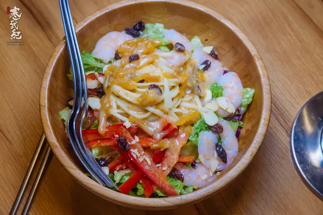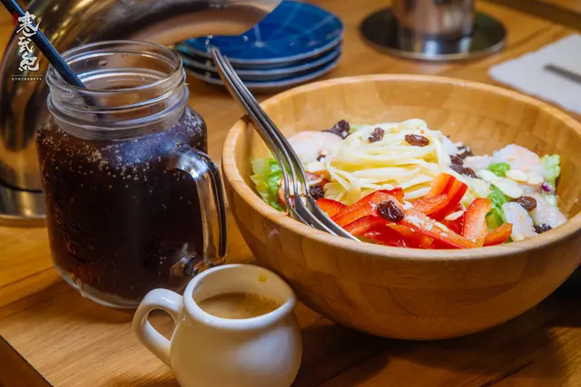 份量很大的義大利麵沙拉,特製的胡麻柚子醬汁帶些酸甜清爽,搭配生菜和蝦仁、紅椒、葡萄乾,重點是當主食吃都可以吃飽的大份量義大利麵!配球牛排吃好像也挺不錯的~~