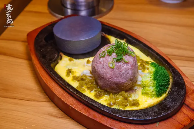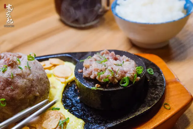 大顆的牛肉漢堡肉球裡面拌入了蒜頭,旁邊陪襯有蒜酥和蛋,喜歡蒜味饕客的最愛!