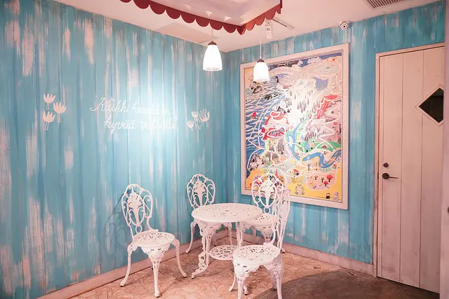 看到嚕嚕米整個太開心,回到家才發現少了門口這張照,那我們就用嚕嚕米來迎接大家囉,在門口這隻嚕嚕米可是相當熱門,熟悉的天空藍整個很療癒耶,牆上還掛了一幅嚕嚕米家的地圖。