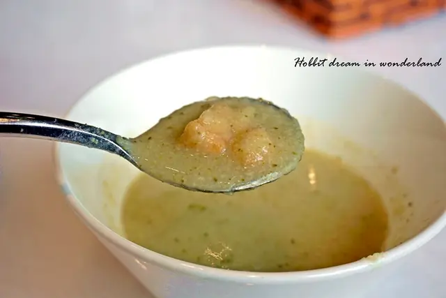青花椰打成末做成的湯底,每口都可以嚐到青花椰顆粒的口感,雖然是濃湯但是卻很清爽,味道真的都單純是花椰菜的清甜而已
