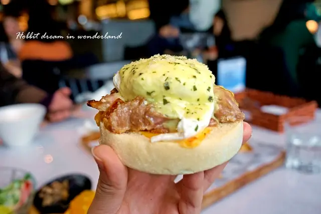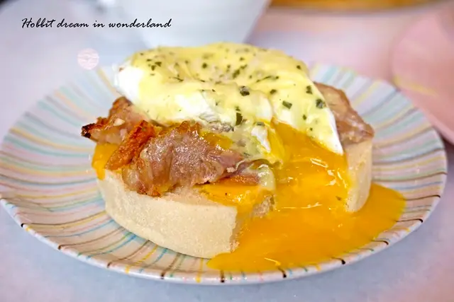 底層英式馬芬麵包基底沾著蛋液、荷蘭醬汁和水波蛋白部分的水嫩,吃起來一點也不乾,非常濕潤