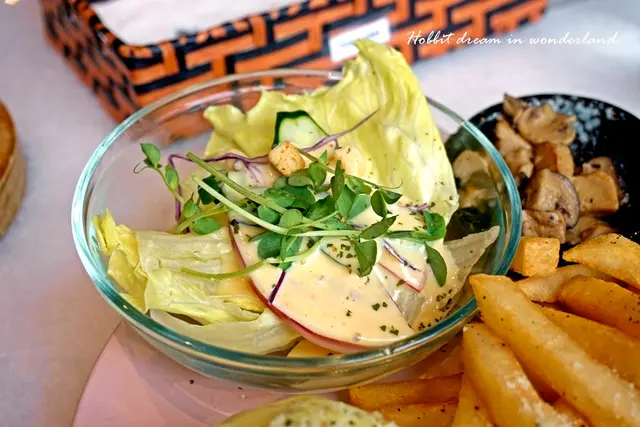 沙拉中規中矩,醬汁味道像是水果優格沙拉醬