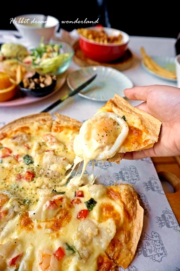 厚片的pizza多了Q度和麵包口感,不過真的非常容易飽也比較會覺得吃完很負擔,個人還是喜歡這種薄片的