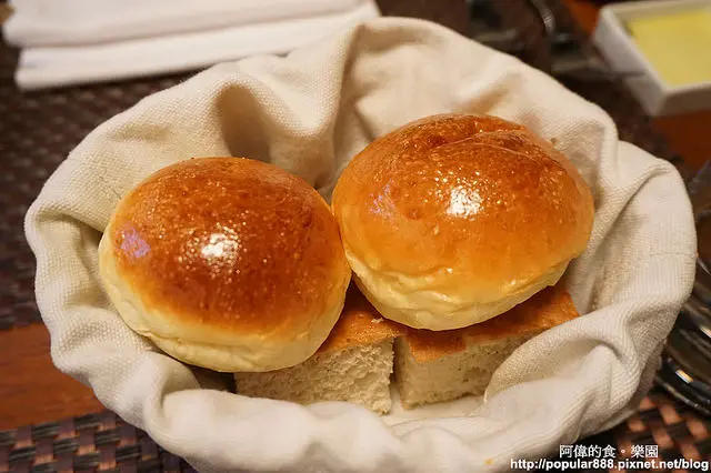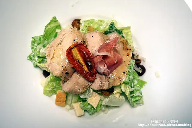 一般凱撒沙拉是吃不到西班牙帕瑪火腿的,也因此這片火腿顯得格外特別。阿偉以前去西班牙玩時,常吃用火腿片做得Tapas(類似小點心),非常有特色。現在能在台北吃到,而且是風乾一年的火腿,鹹度比我想像的低(以往吃過蠻鹹的火腿),跟著軟嫩的雞肉一起,搭配帶著起司味的凱撒醬,口味豐富好吃。