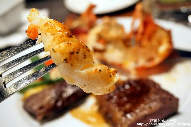 接著是期待已久的主菜登場,”炭烤4盎司的Prime級肋眼牛&半隻波士頓龍蝦”。這半隻龍蝦的作法分為炭烤跟焗烤,阿偉選的是炭烤。