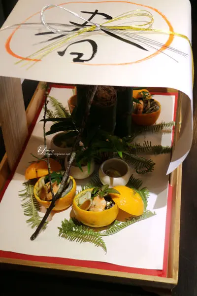 這天料理長以傳統的方式,呈現出日本新年的御節料理。